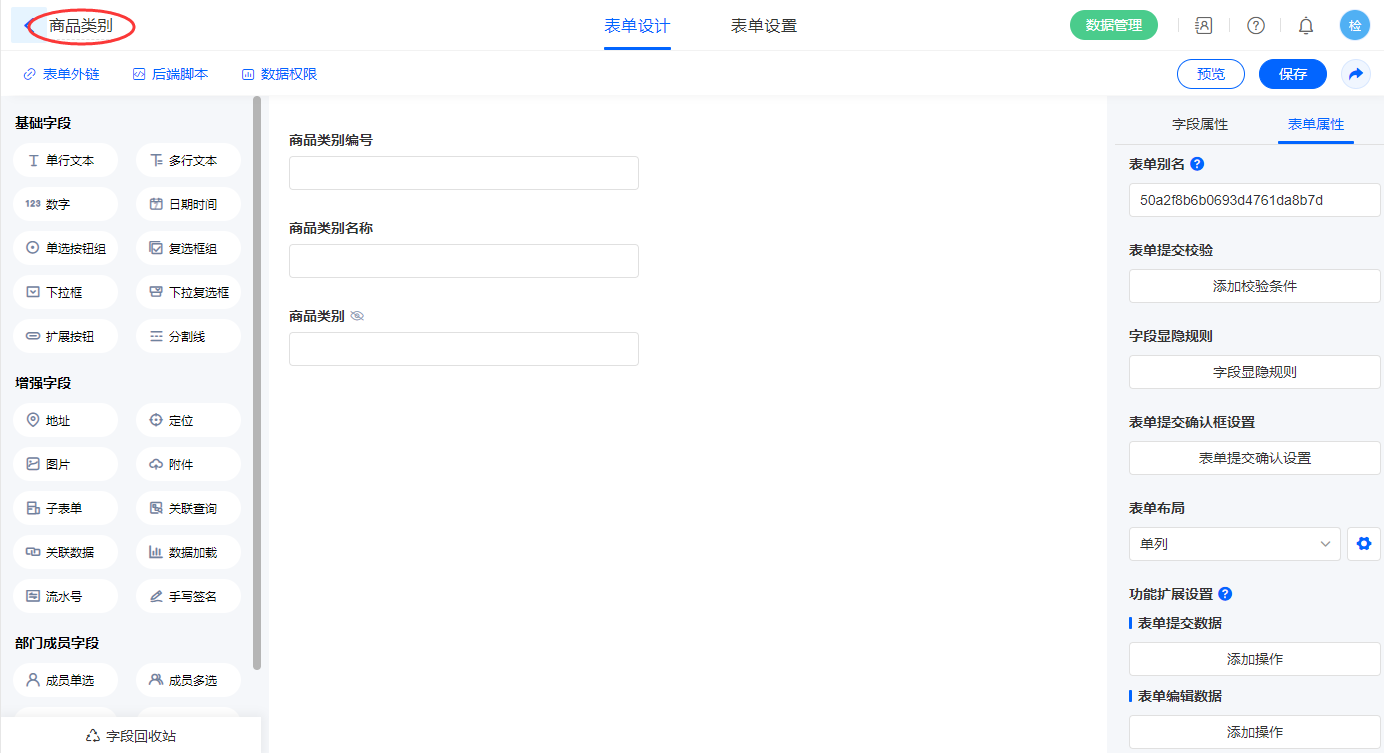 2)新增表单【商品类别】,字段设置如下;
