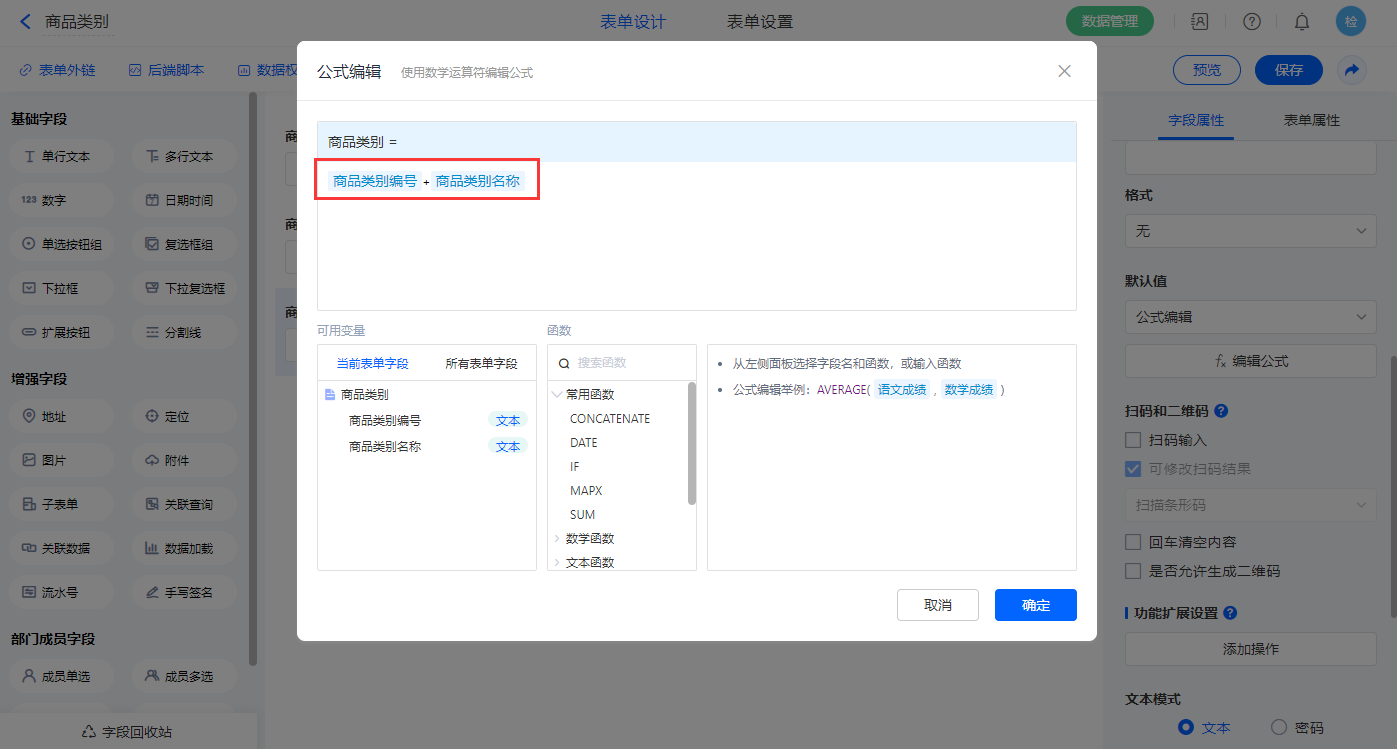1)选择【商品类别】字段,设置默认值为公式编辑,如图设置公式;