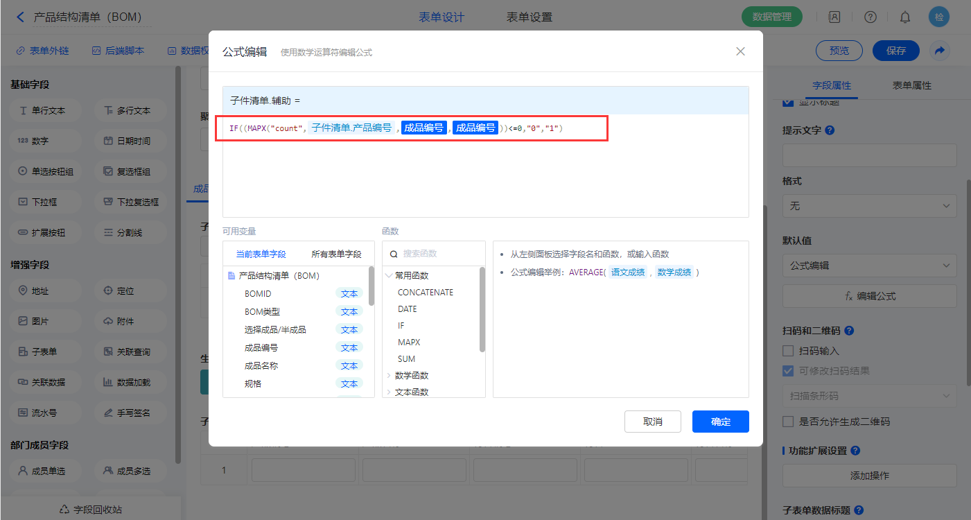 【子件清单.关联半成品BOMID】字段,设置默认值为公式编辑,如图设置公式;