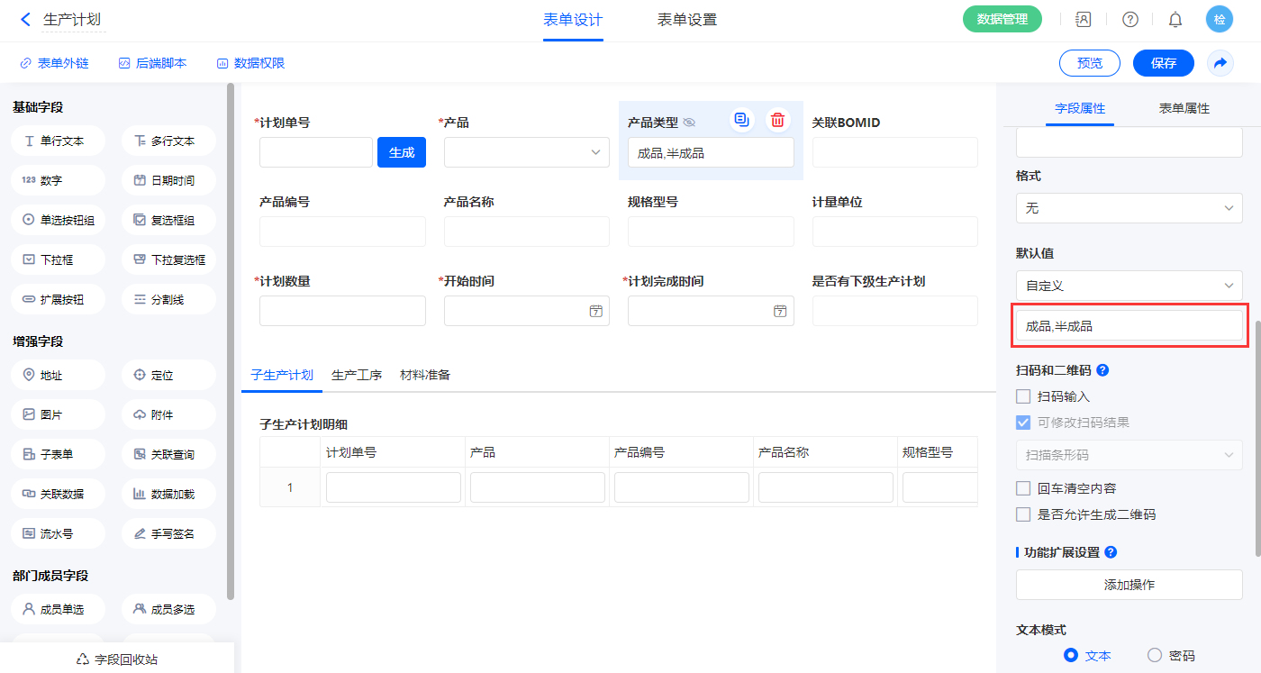 1)【产品类型】字段,设置默认值为“成品,半成品”;