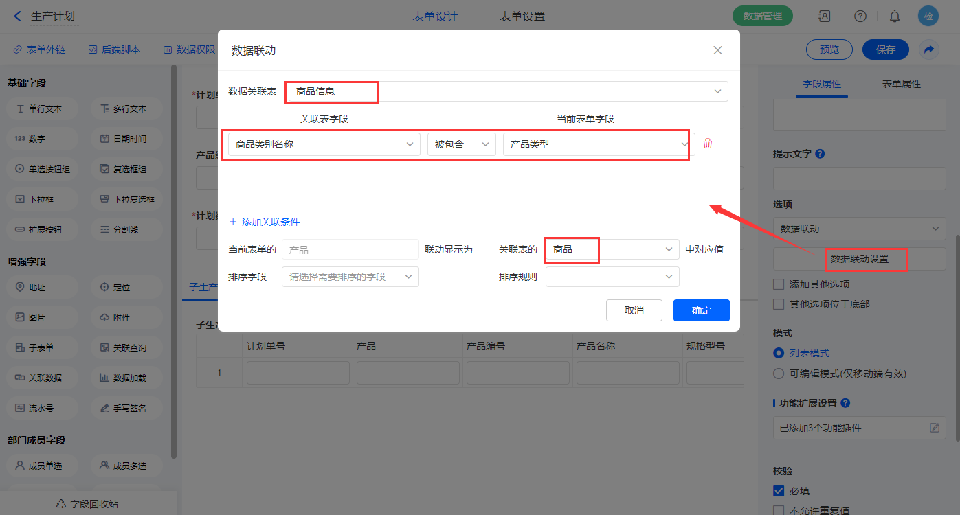 【商品类别名称】字段,设置默认值为数据联动,设置联动条件及联动字段;
