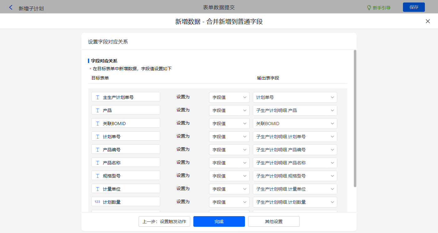 名称为生成下级生产计划工序的数据助手,新增新增数据执行动作,选择目标表单【生成下级生产计划工序】,设置对应赋值字段,设置好点击【完成】并保存该数据助手;