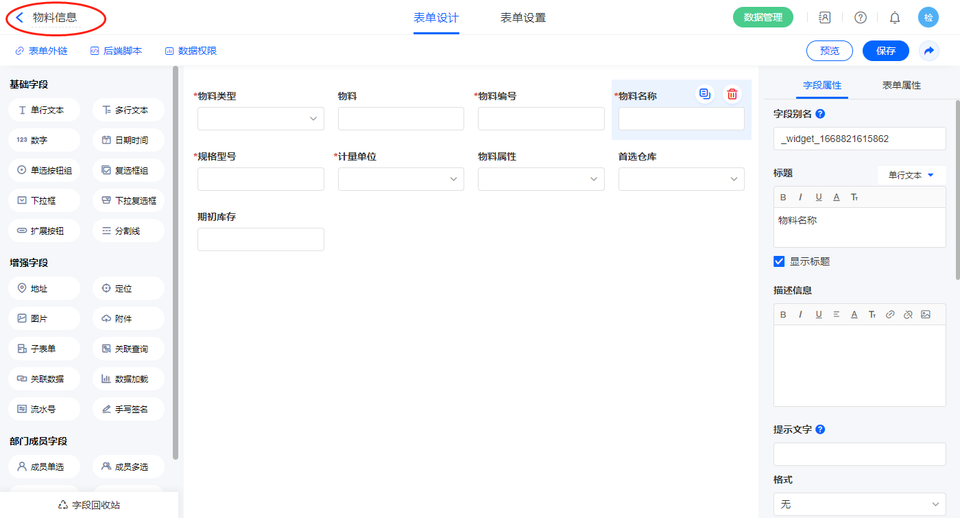 | 物料名称 | 单行文本 |