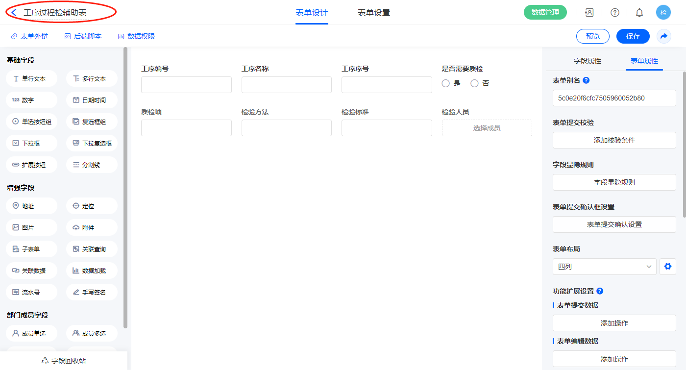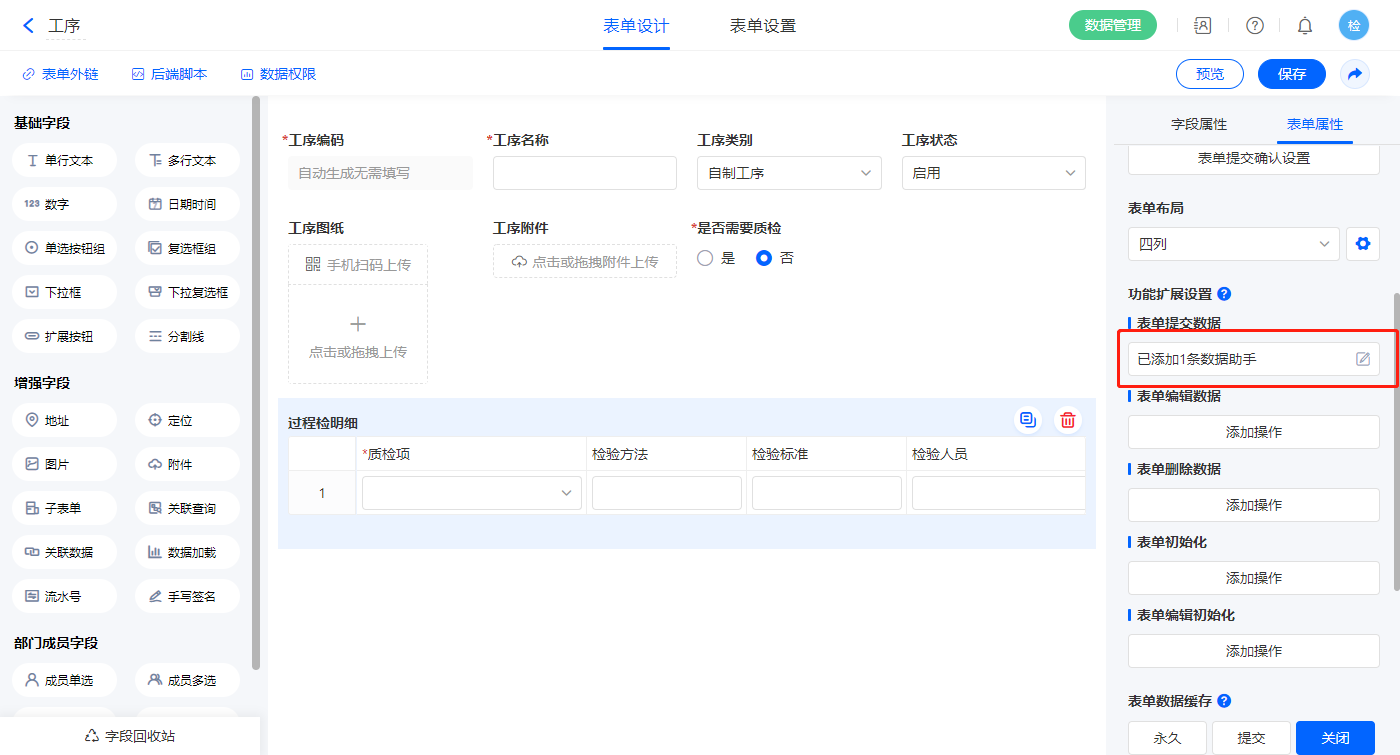 2.2、表单【工序】字段及表单属性设置