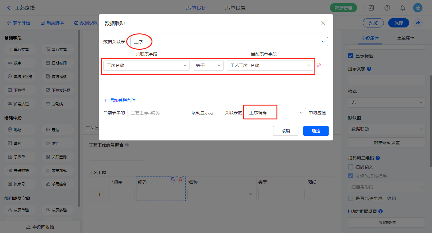 【工艺工序.编码】、【工艺工序.类型】、【工艺工序.图纸】、【工艺工序.附件】字段,设置默认值为数据联动,以上字段关联表及关联条件相同,设置对应的联动字段即可;