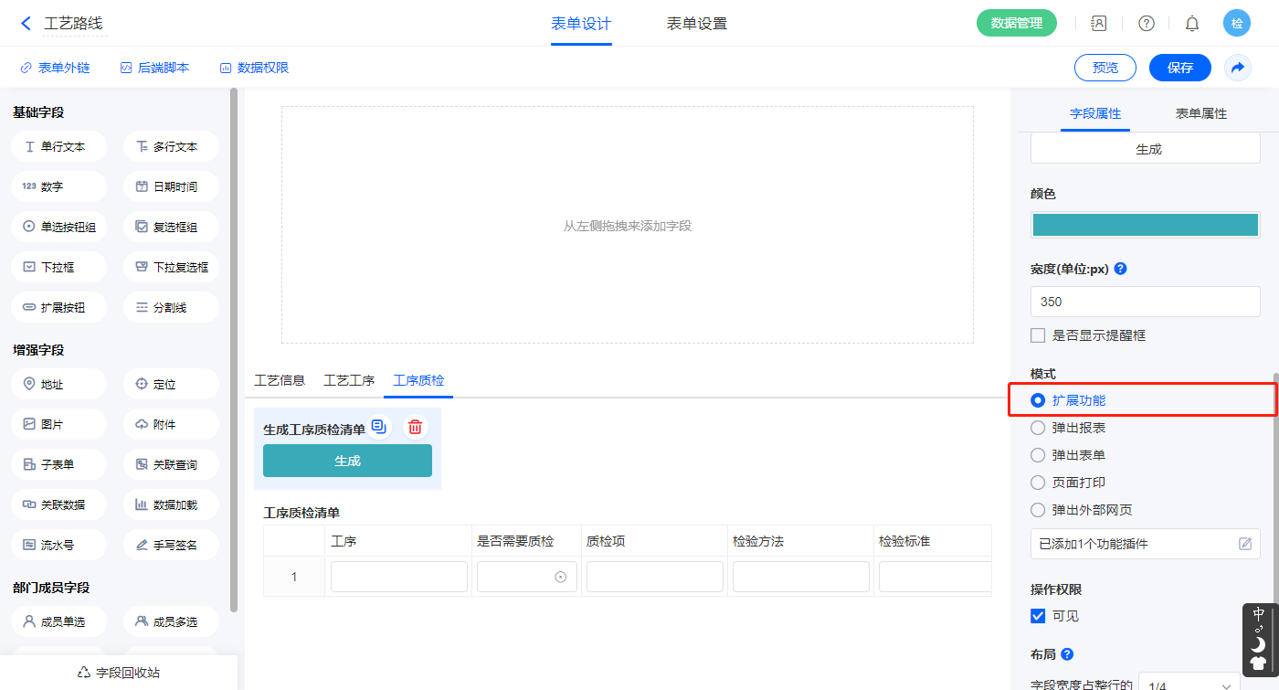 3)【生成工序质检清单】扩展按钮字段,模式选择扩展功能;