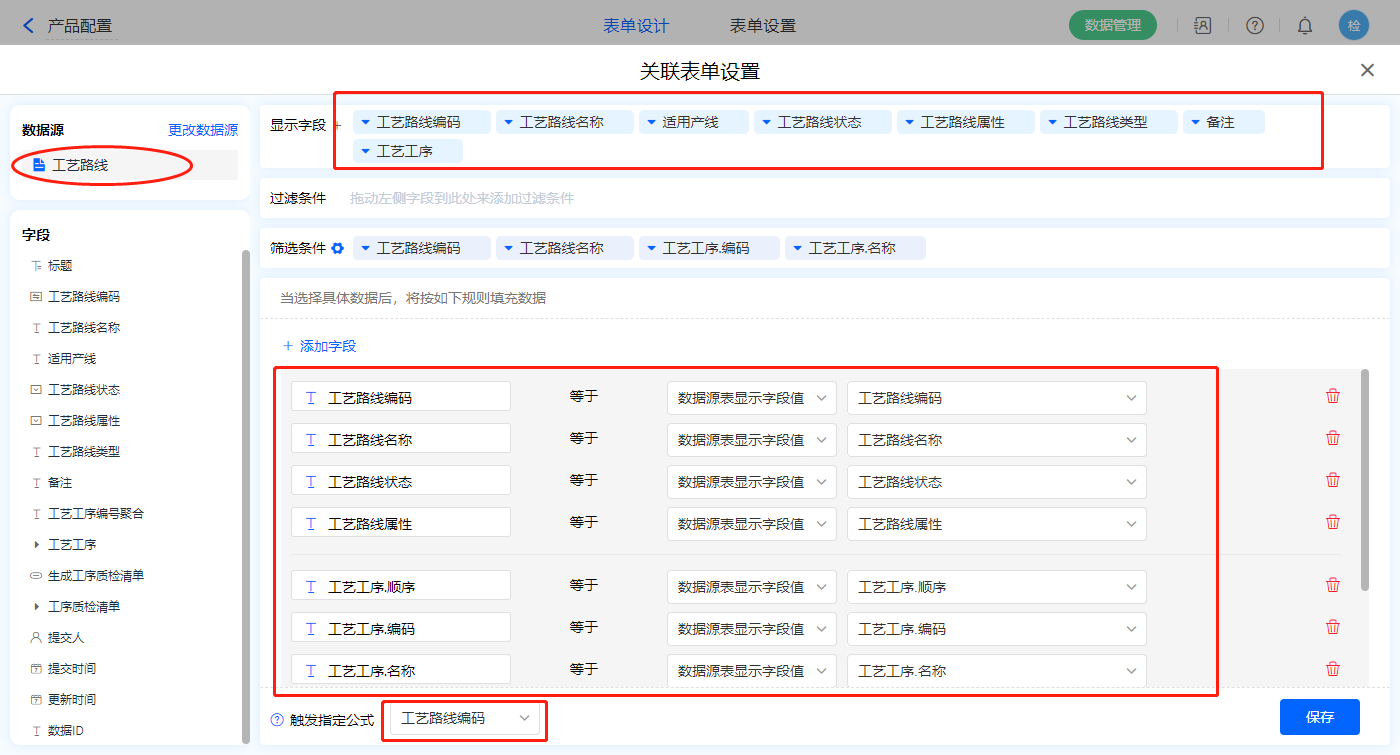 4)【选择工艺】数据加载字段,数据源为【工艺路线】,添加显示字段设置赋值字段及筛选条件,触发公式为【工艺路线编码】字段,点击保存;