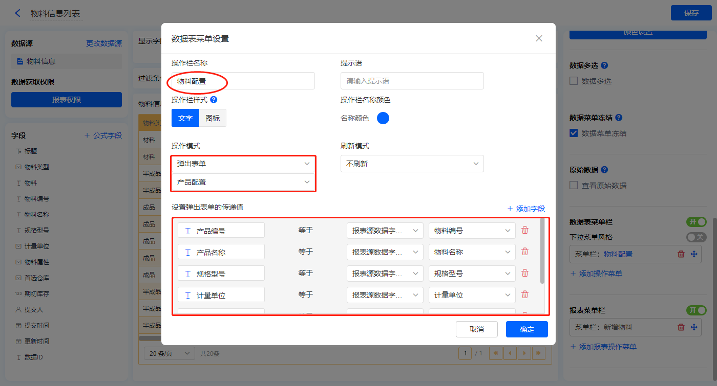【物料配置】菜单栏,操作模式设置为弹出表单【产品配置】;