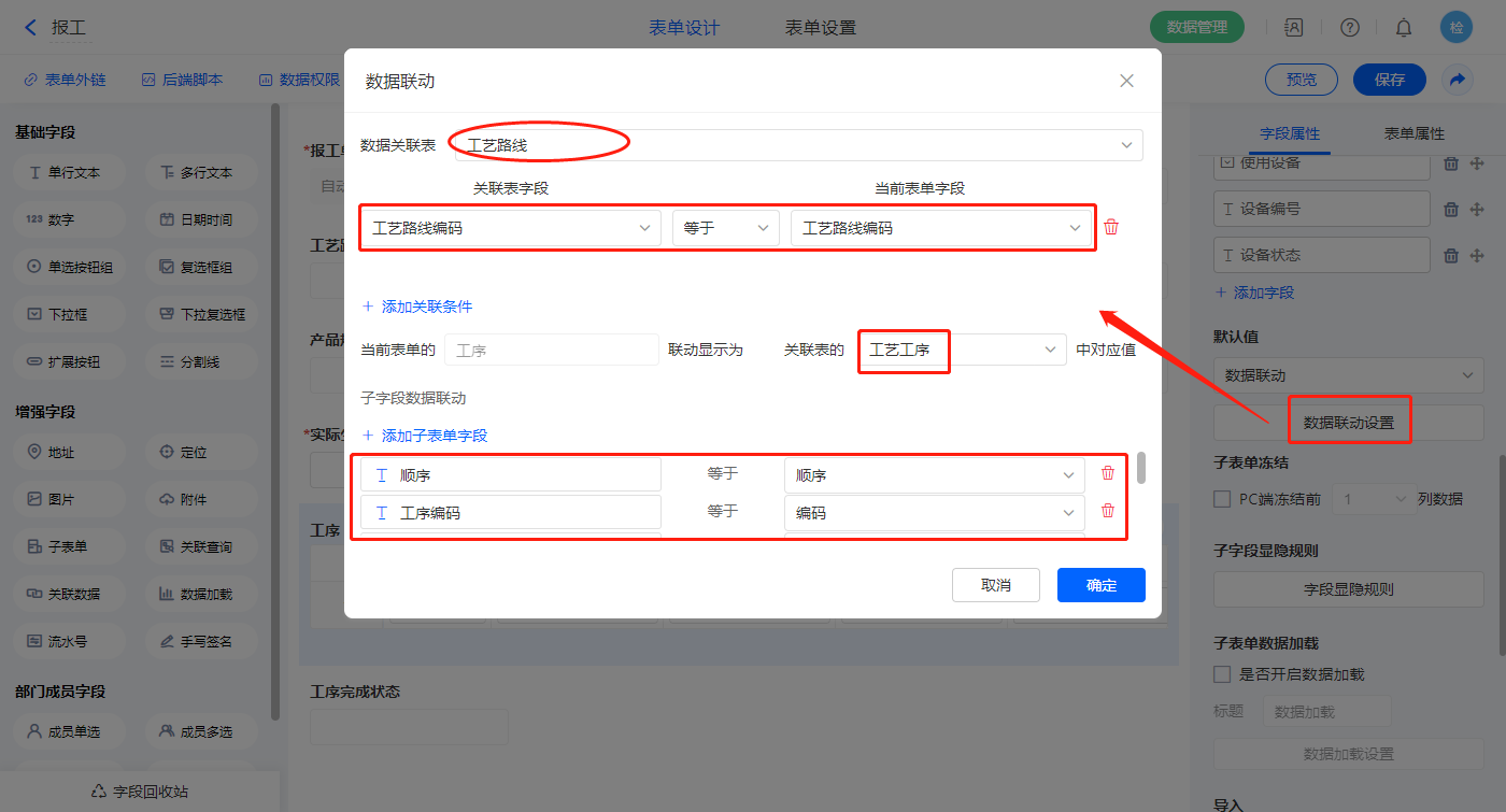 2)【工艺工序】子表单字段,设置默认值为数据联动,关联表及关联条件相同,设置对应的联动字段即可;