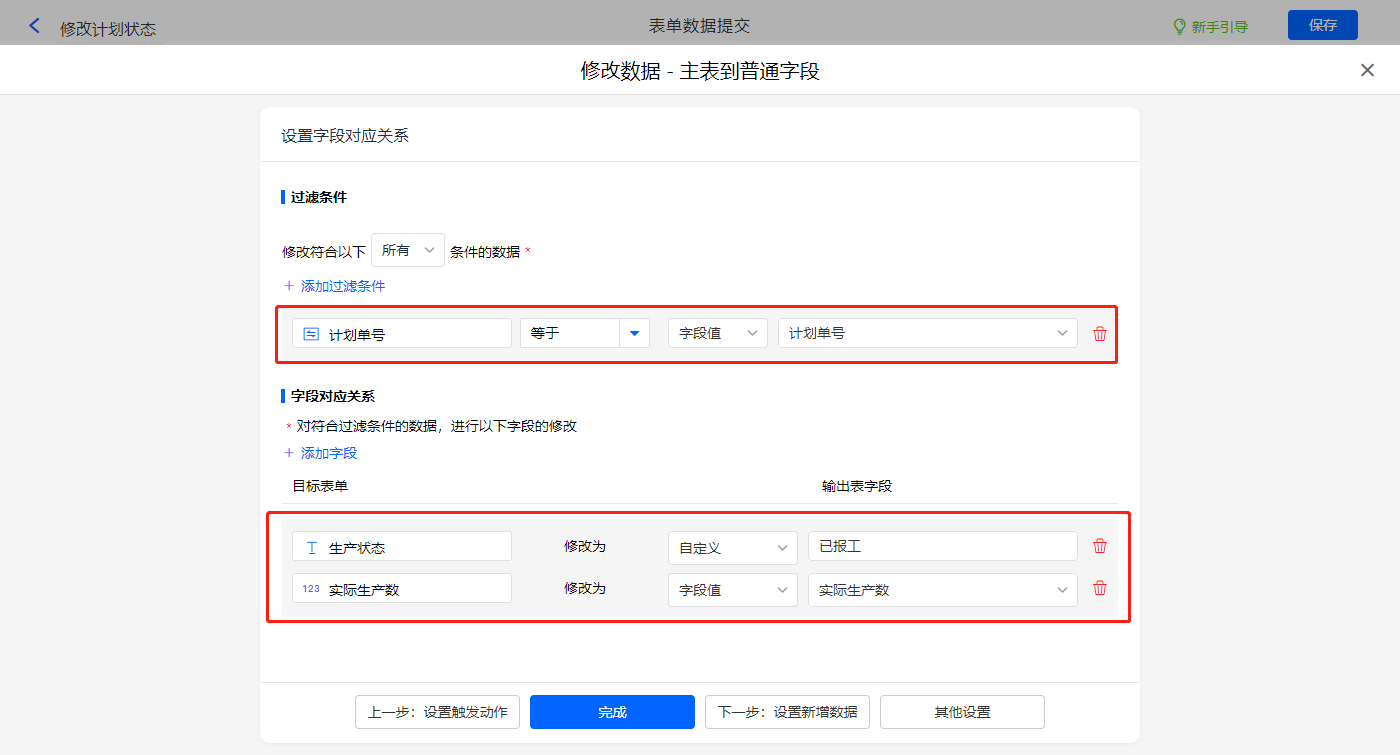 名称为修改生产计划状态,新增修改数据的执行动作,选择修改【生产计划】表单,选择对应过滤条件,以及需要修改的字段,设置好点击【完成】并保存该数据助手;