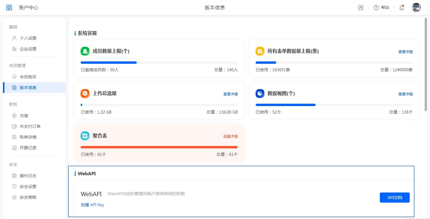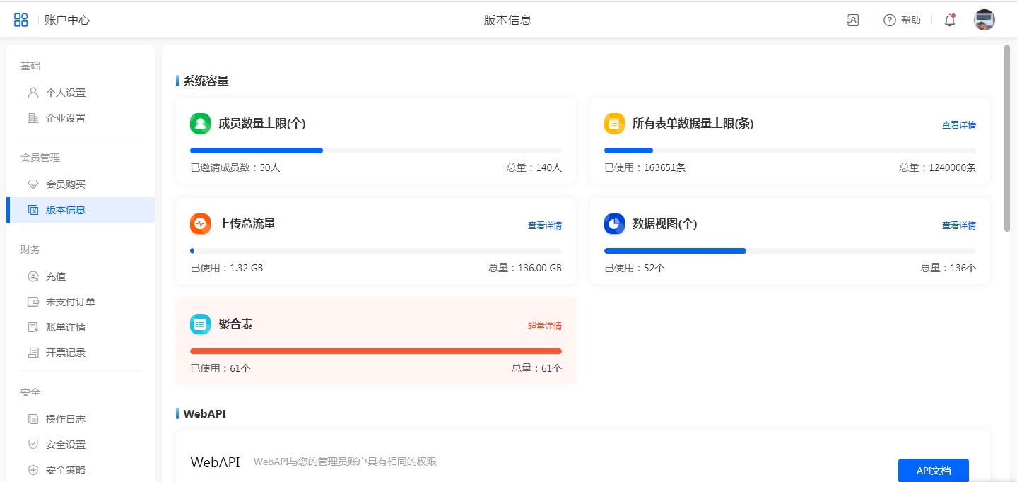 版本信息中可以查看当前版本的使用情况。
