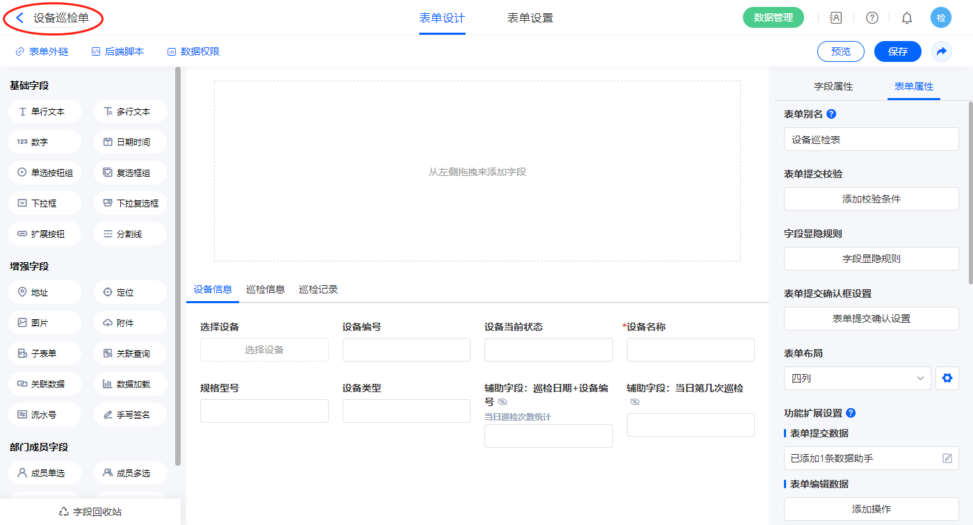 4)表单提交设置1条数据助手,名称为设备巡检处理;
