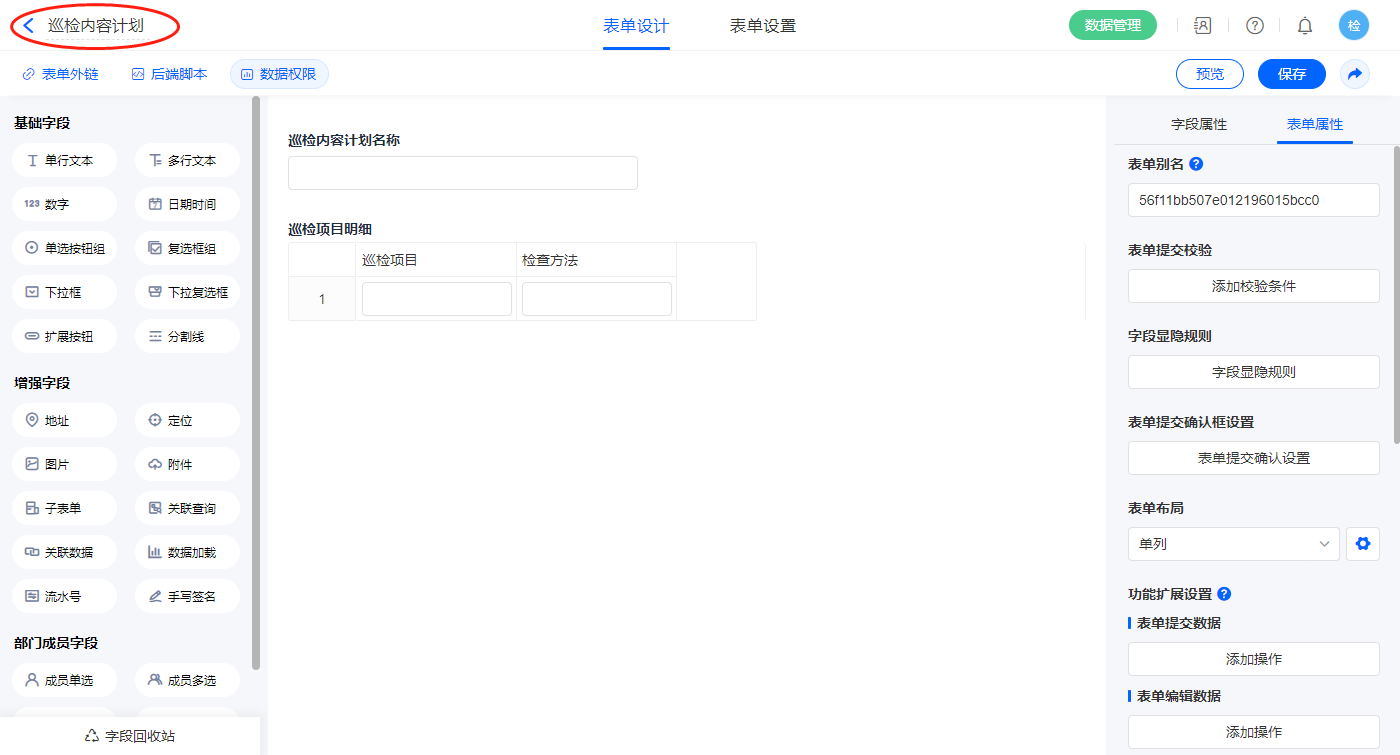 2)【巡检方案】字段,选择设置为关联其他表单数据,关联巡检方案的【巡检方案名称】字段;