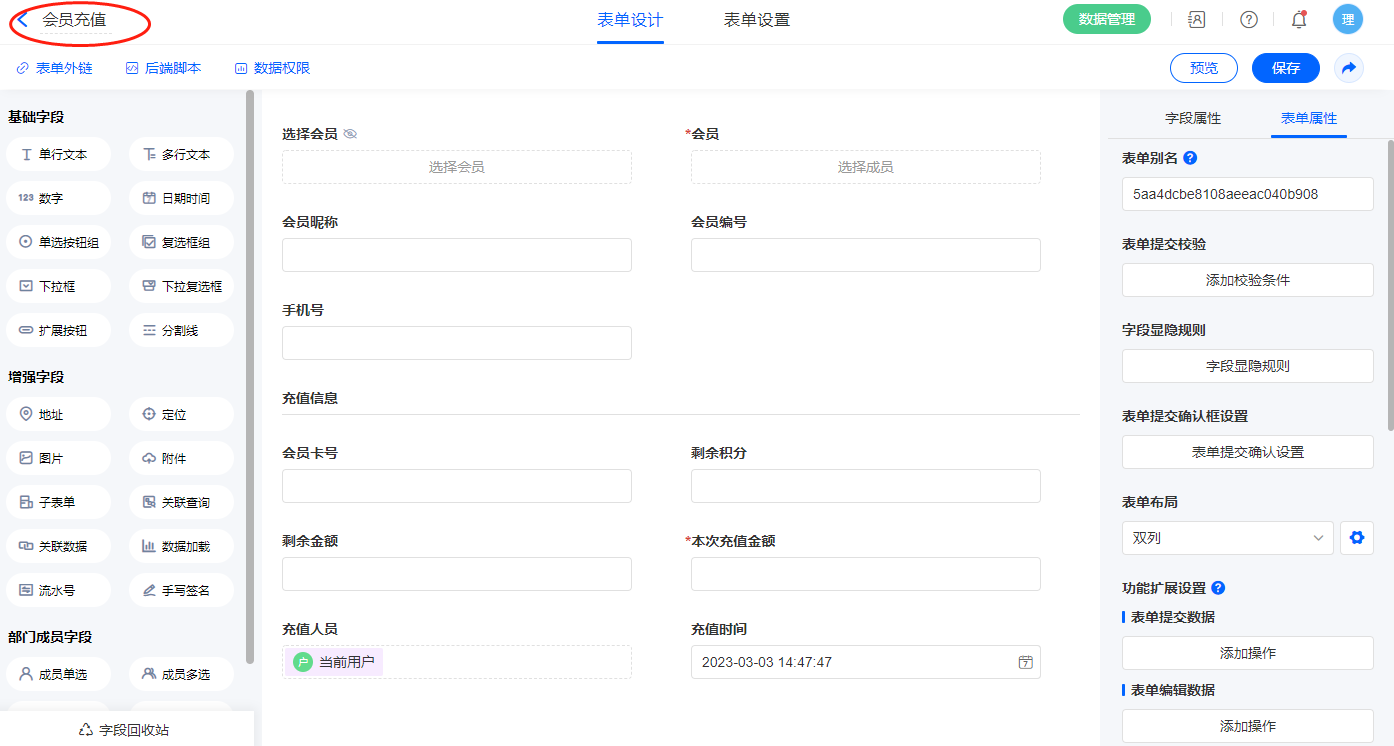 【会员充值】的菜单栏,操作模式设置为弹出表单【会员充值】;