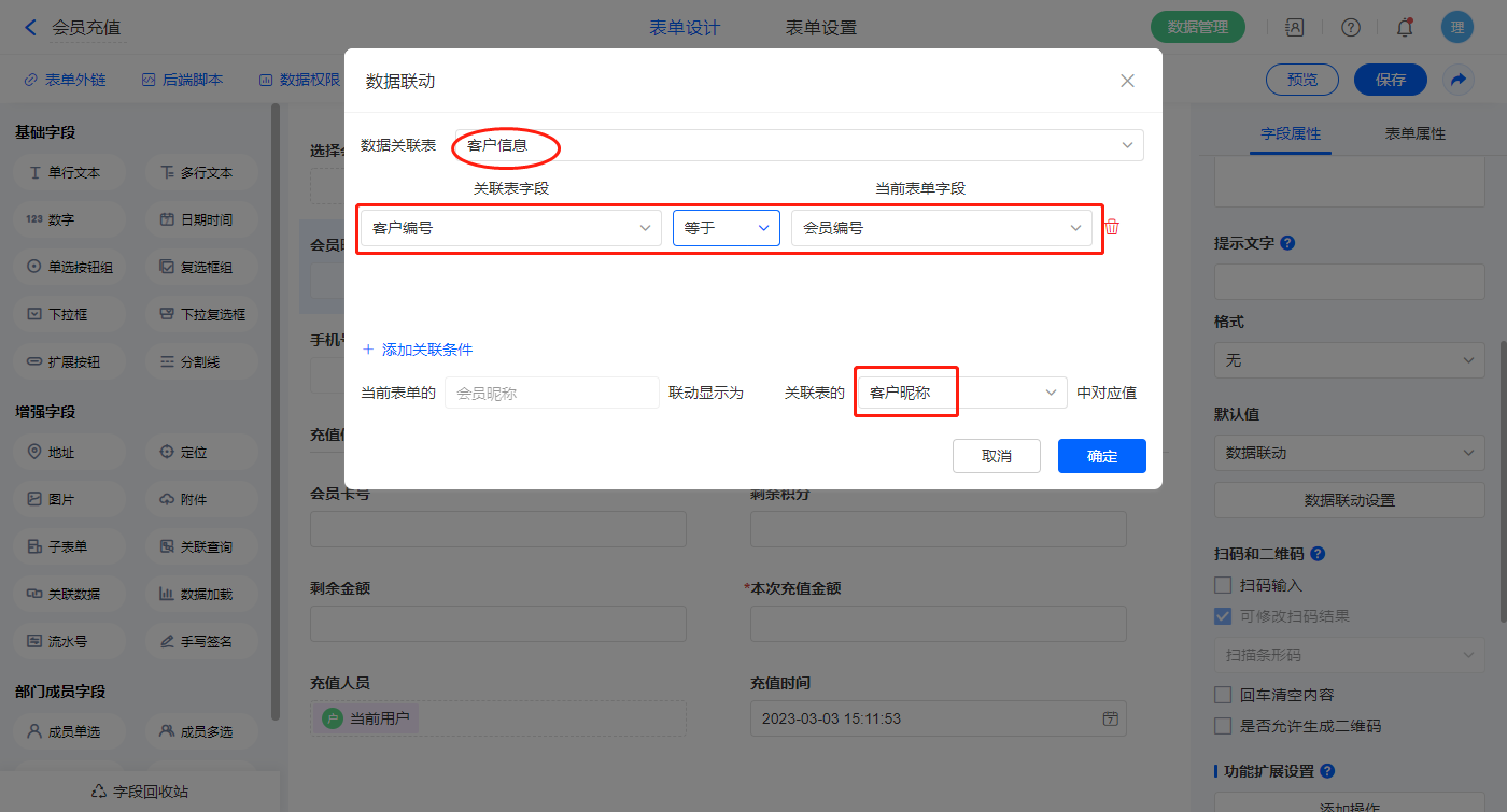 【客户昵称】字段,设置默认值为数据联动,设置联动条件及联动字段;