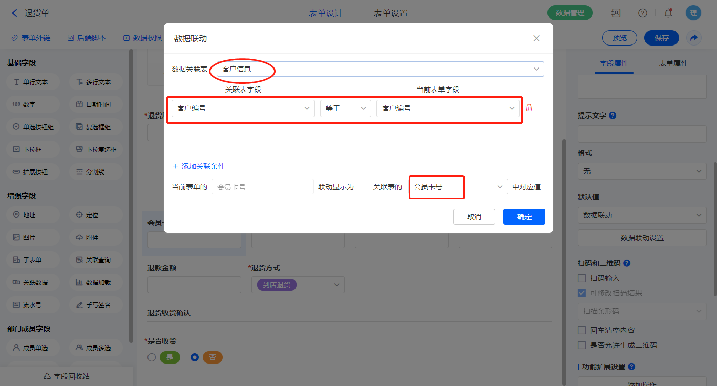 【会员卡号】字段,设置默认值为数据联动,设置联动条件及联动字段;