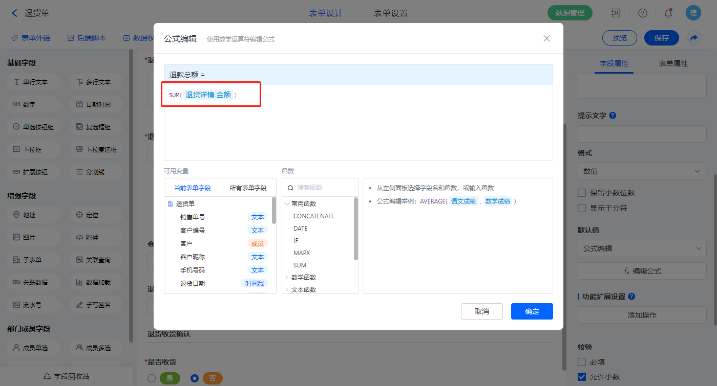 【退款总额】字段,设置默认值为公式编辑,如图设置公式;