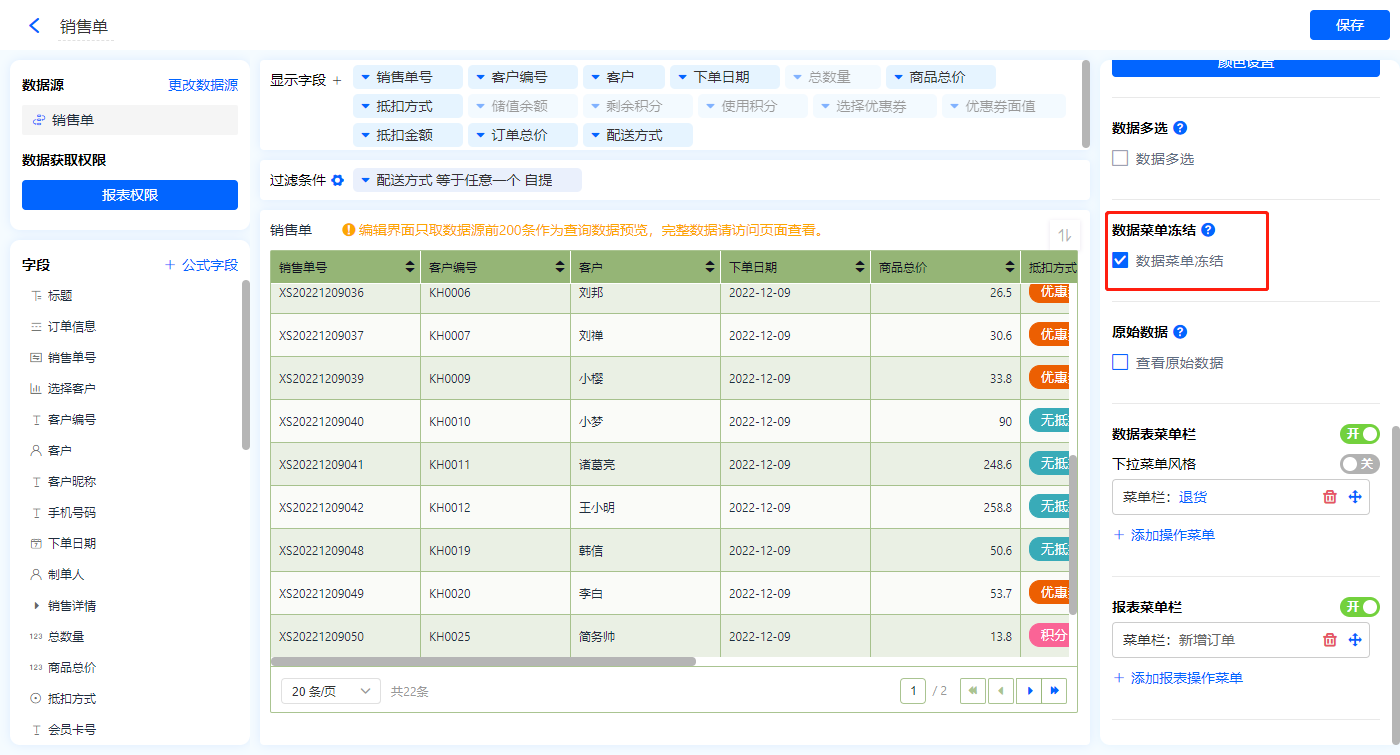 1)参照2.8、【自提销售单】表单的搭建方式,变更数据表的过滤条件为【配送方式】等于商家配送;