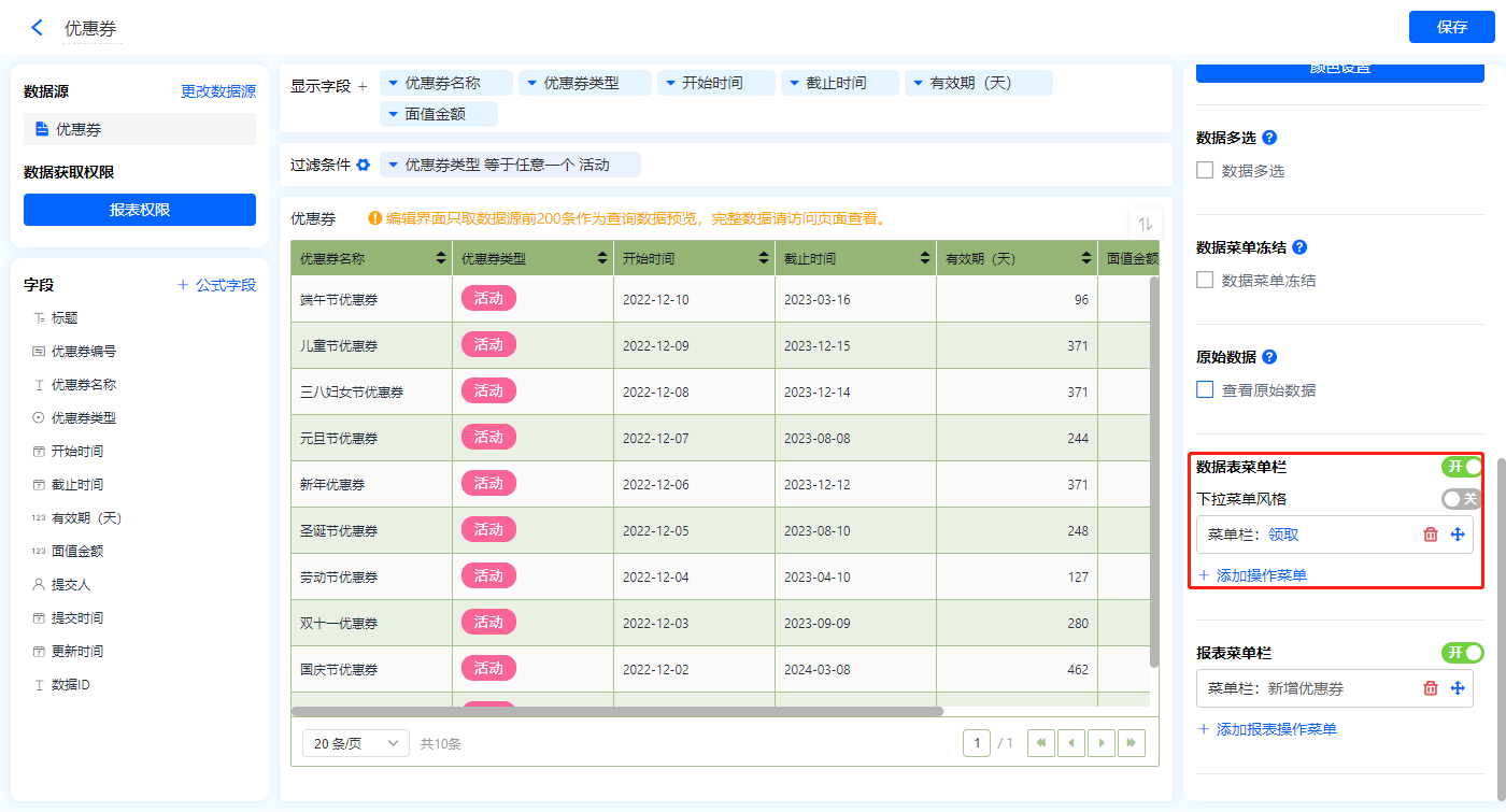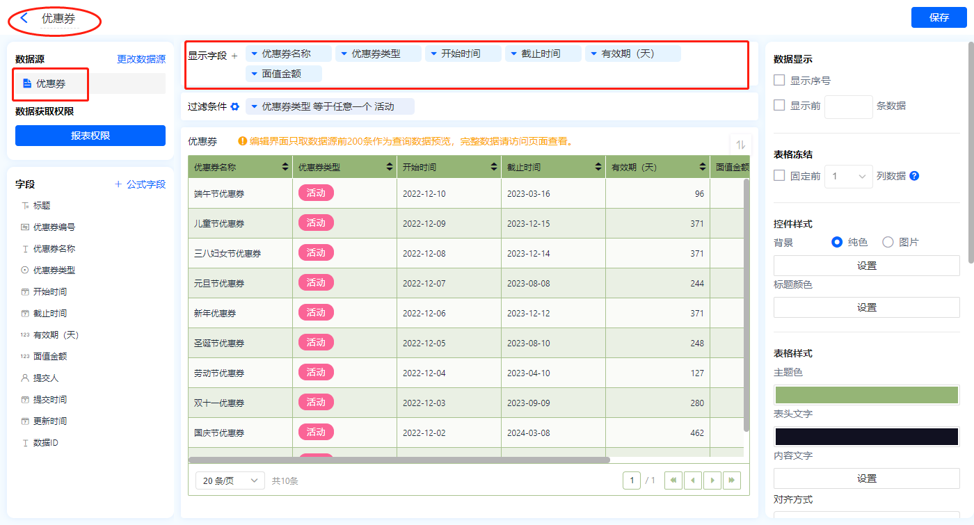 1)新增【优惠券】报表,用基础报表【数据表】展示数据源为表单【优惠券】的数据;