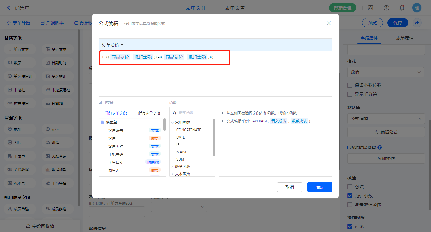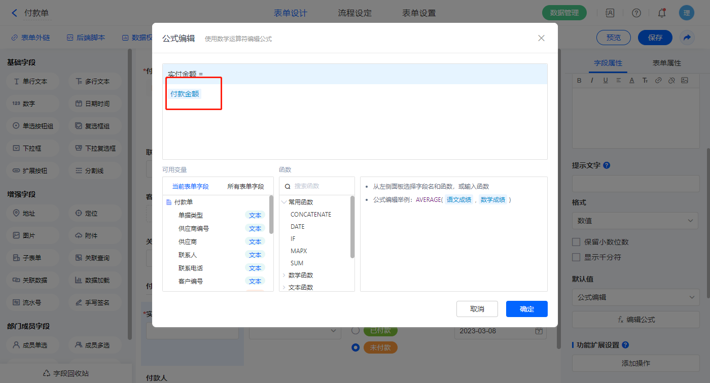 2)【实付金额】字段,默认值选择公式编辑,如图设置公式;