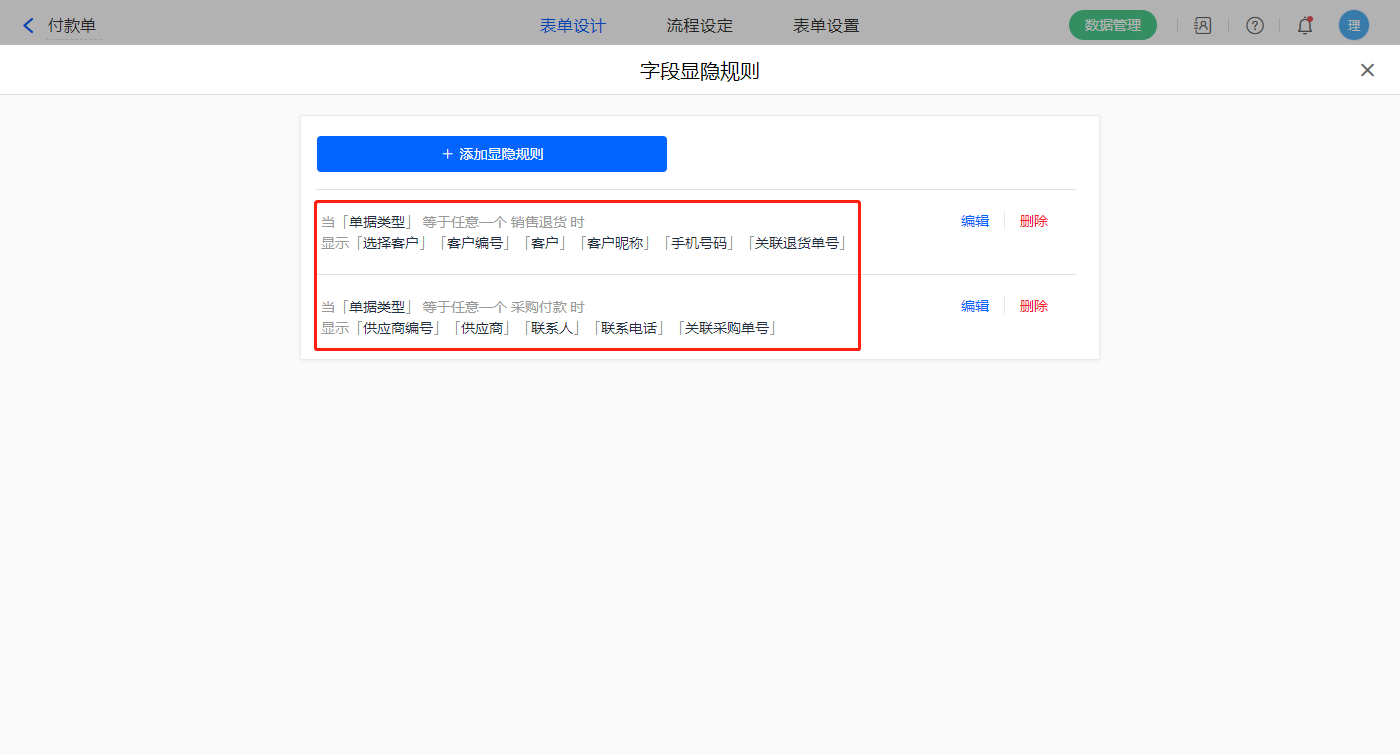 3)设置两条显隐规则,当【单据类型】字段等于销售退货显示【选择客户】、【客户编号】、【客户】、【客户昵称】、【手机号码】、【关联退货单号】字段,当【单据类型】字段等于采购付款显示【供应商编号】、【供应商】、【联系人】、【联系电话】、【关联采购单号】字段;