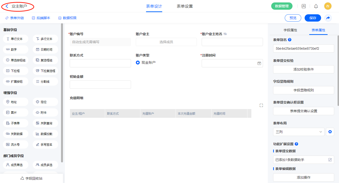 2.3、表单【业主账户】字段及表单属性设置