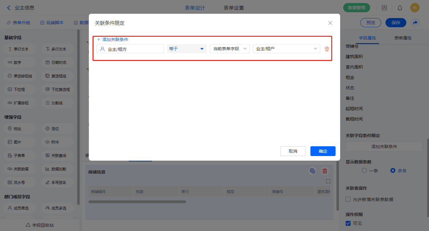 设置关联条件,【业主/租户】字段作为关联条件;