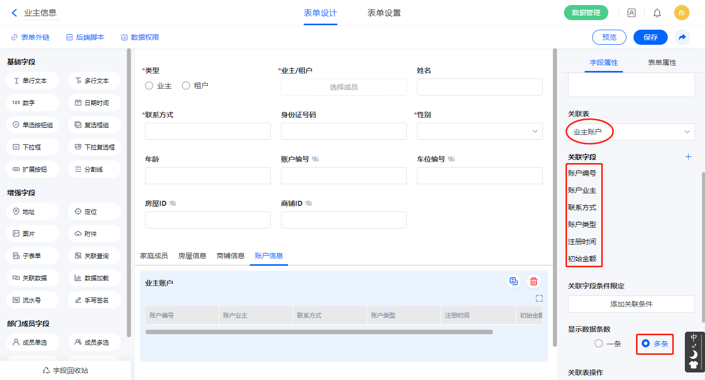 2)【业主/租户信息】关联查询字段,设置关联表为【业主信息】并如图选择关联字段,设置显示数据条数为多条;