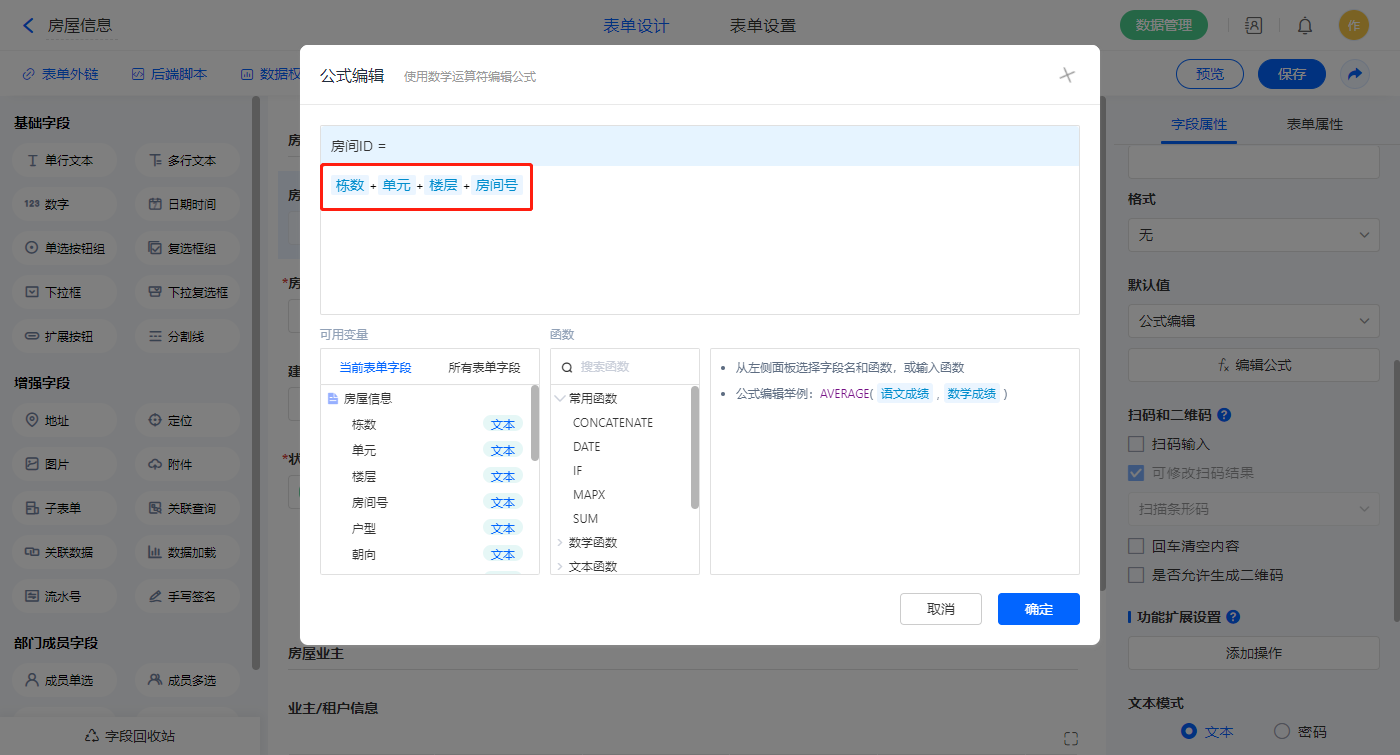 3)【房间ID】字段,默认值选择公式编辑,如图设置公式;