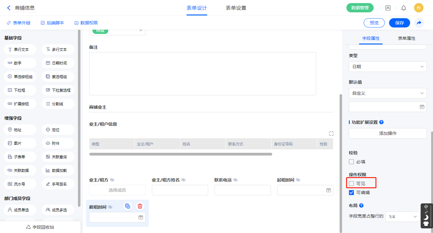 2.7、表单【业主商铺】字段及表单属性设置