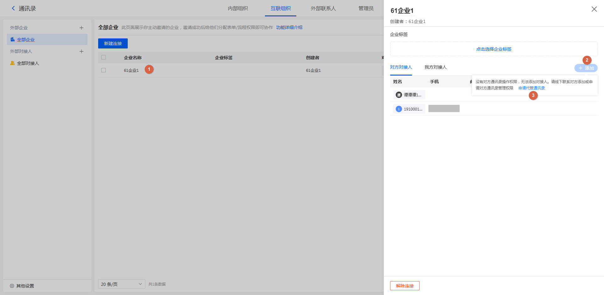 - 通过邀请链接进行企业互联时,若公开链接设置了代管权限,连接后也可具备通讯录代管权限。