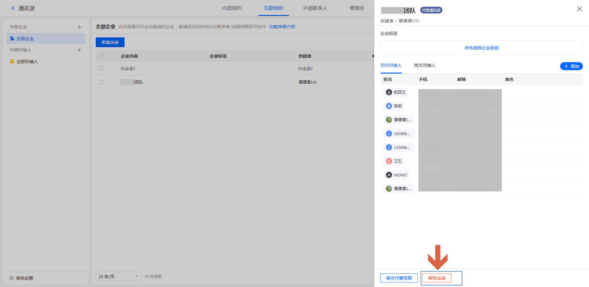 接管企业在「全部企业」列表中解除连接也可以让被接管的企业恢复自主管理通讯录状态。如下图所示:
