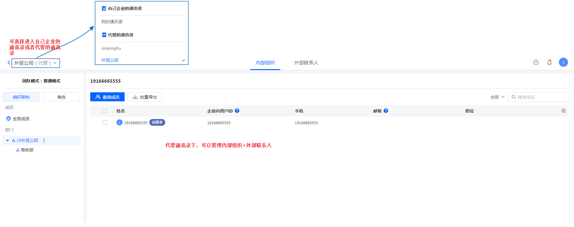 拥有代管权限的企业,可以管理代管企业的通讯录,支持管理内部组织和外部联系人。