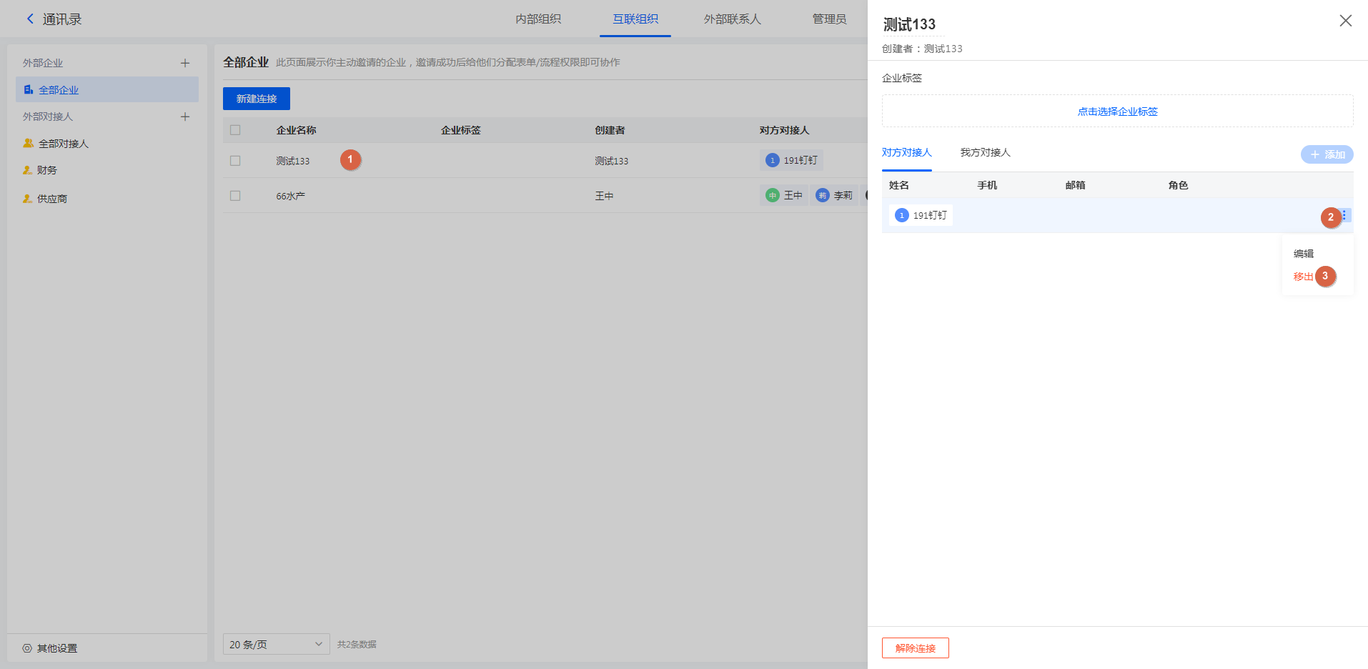 3)企业详情中移除对方对接人