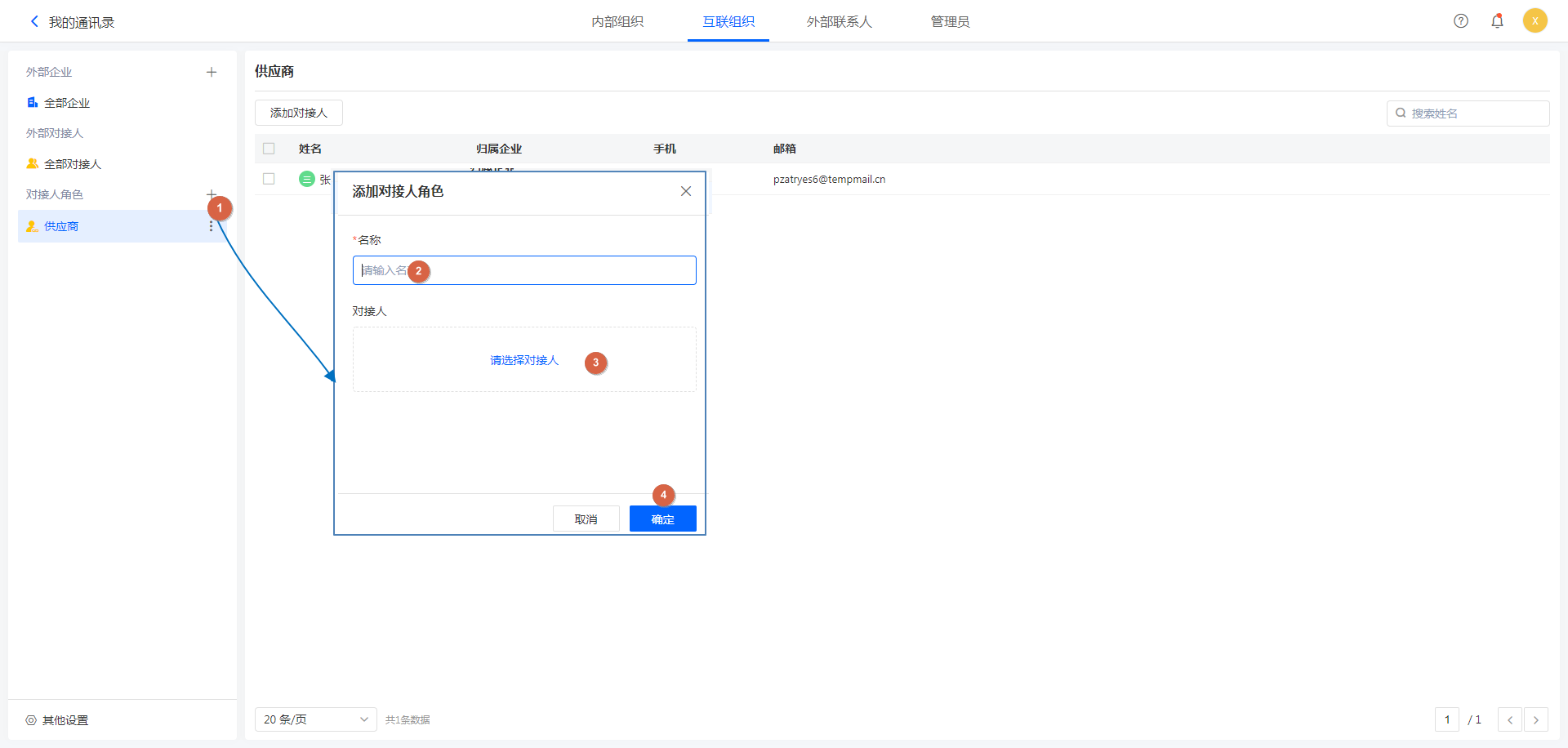 为角色添加对接人,可以是不同企业的不同对接人。如下图所示: