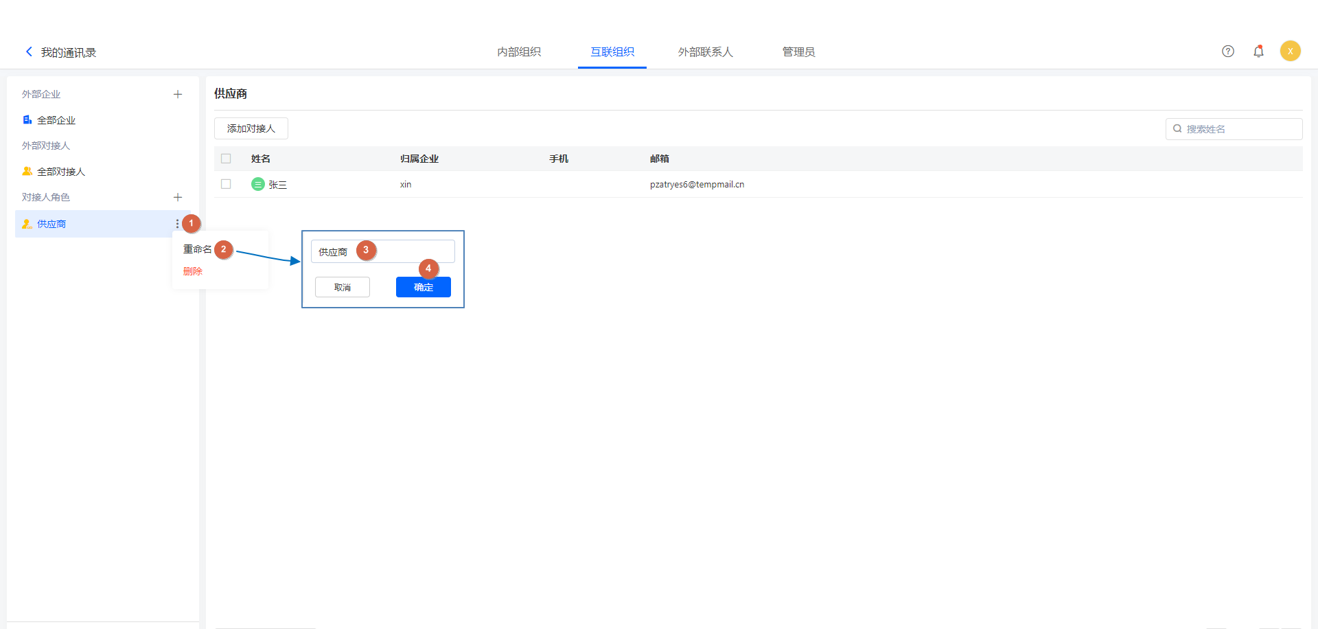 注意:只有内部成员可以设置为对接人,外部联系人不可设置为对接人;即外部联系人不参与企业互联的任何业务。