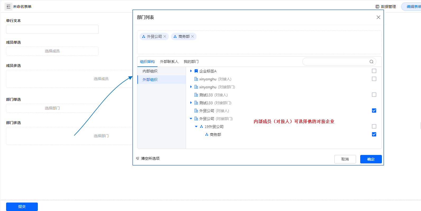 互联组织的对接人在有 权限 的情况下,进入到主企业发布的表单中选择部门时,只能选择自己所在的企业及企业对接部门、内部组织的对接部门。