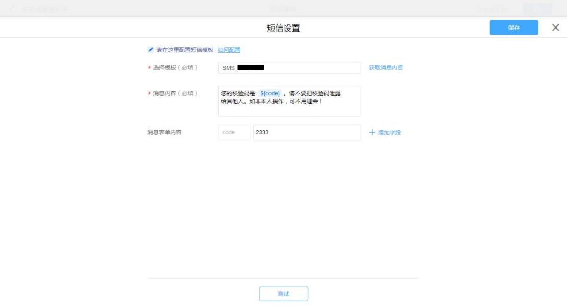 - 选择模板:必填,必须输入有效的短信模板;