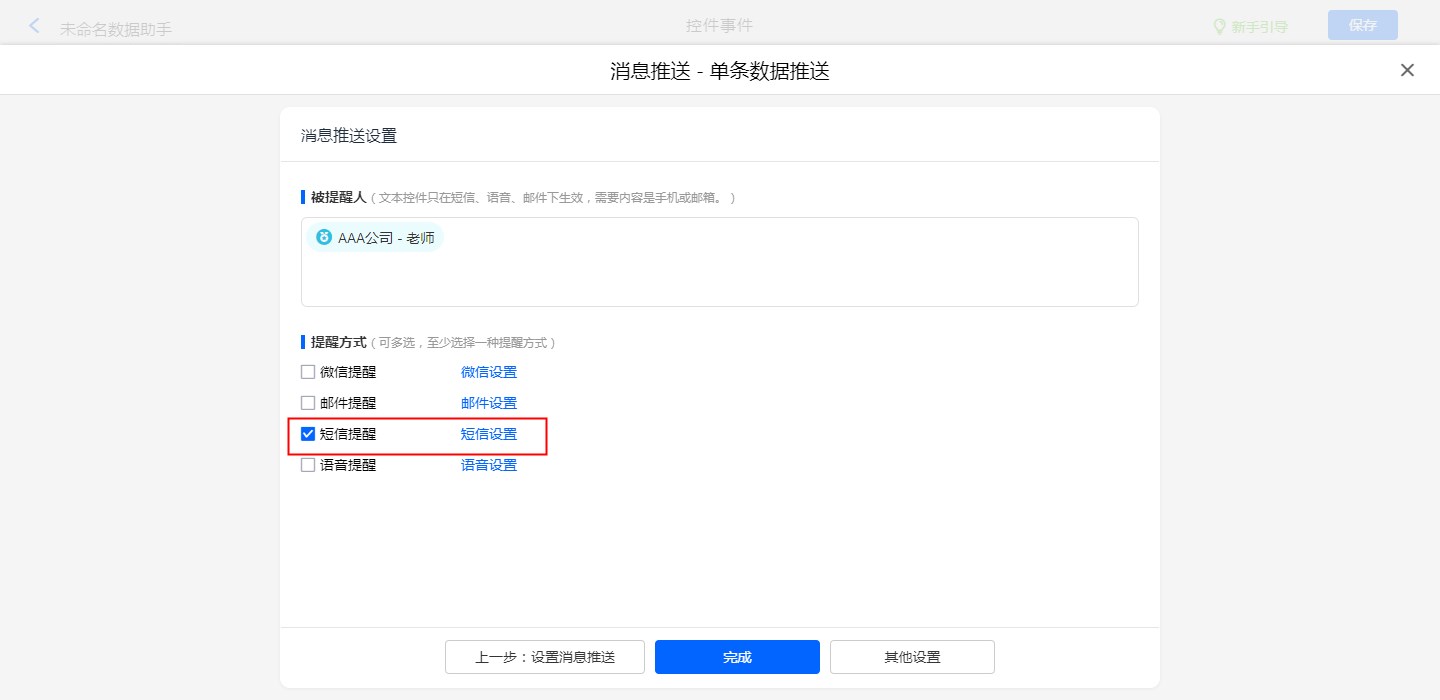 【新建数据助手】-【配置好数据源及输出表】-【执行动作选择消息推送】-【消息推送设置】-【提醒方式】-【短信提醒,短信设置】