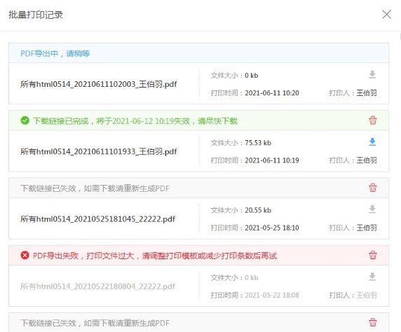 在打印记录中记录了当前表单的批量打印日志,包括打印中、打印失败、支持下载记录、下载失效记录,日志信息支持删除。