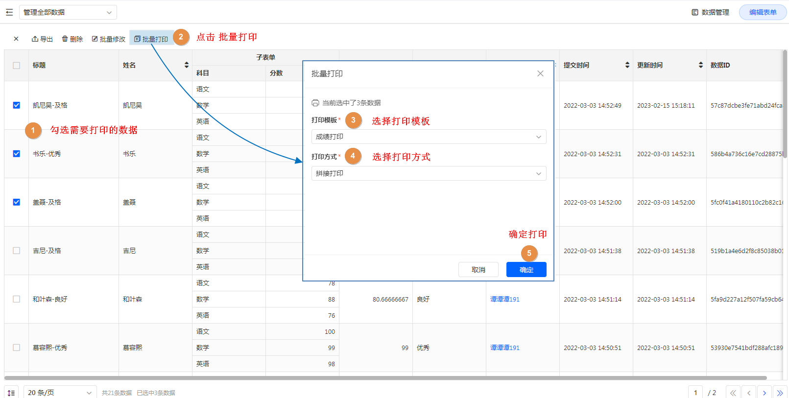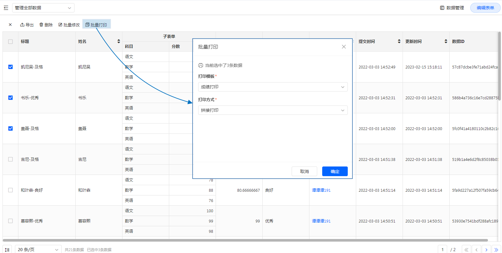 1、批量打印可以由管理员在【数据管理】处进行操作 ,选中需要打印的数据并打印
