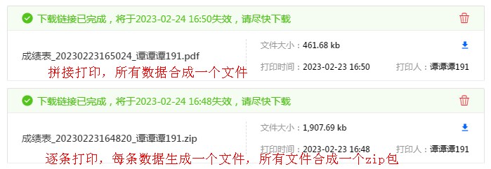 逐条打印:每条数据生成一个打印文件,所有文件生成一个压缩包。