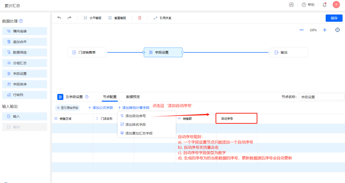 自动序号、排名、累加汇总 三个只能添加其一,如果要再加,需要自行增加一个字段设置节点。