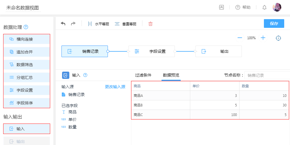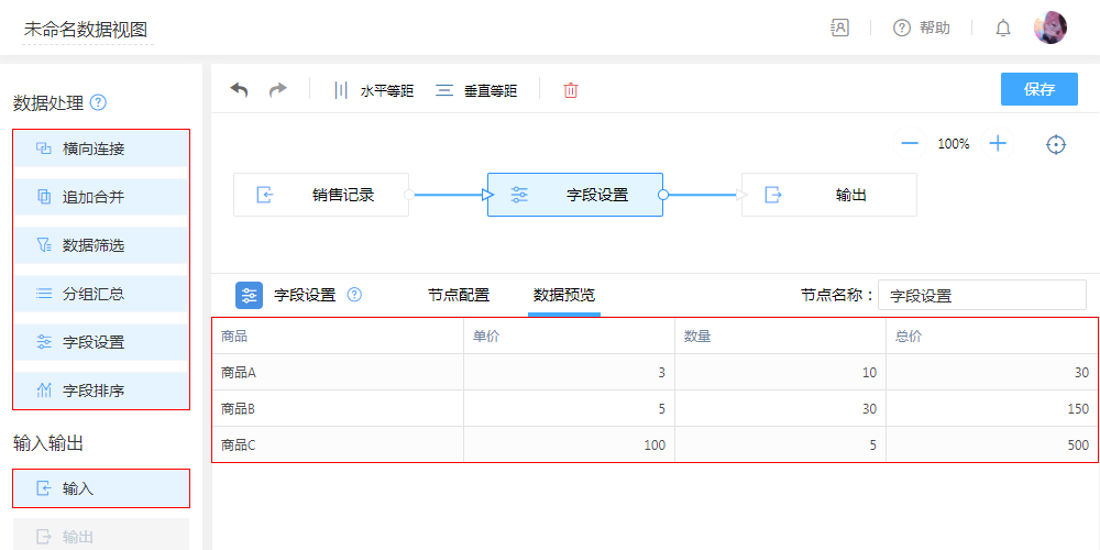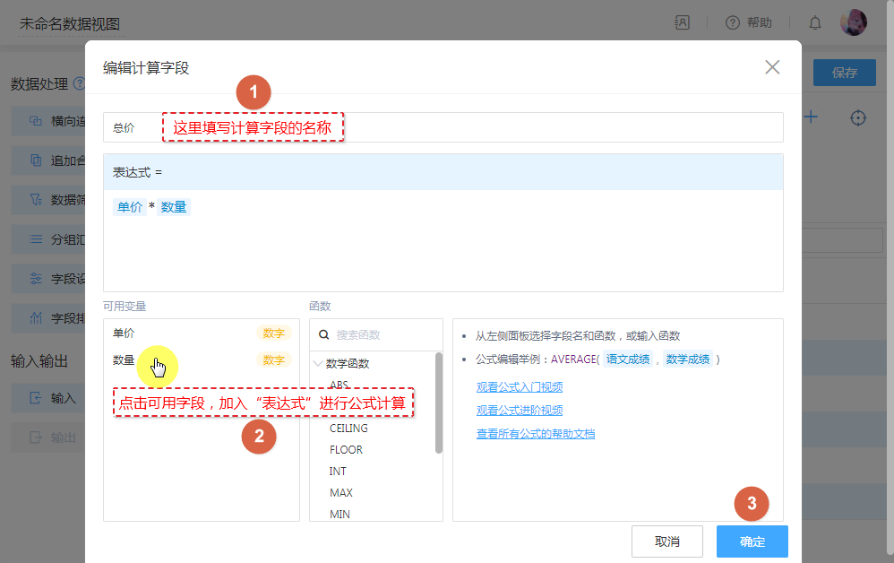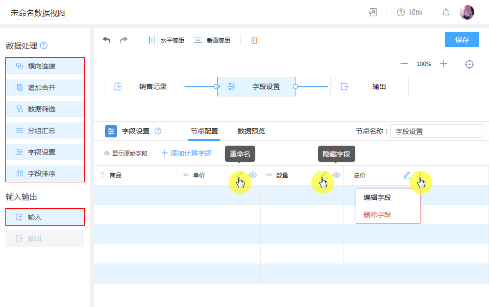 除了主要配置“公式字段”,还可以在此节点对字段重命名,隐藏显示,调整列的排序。