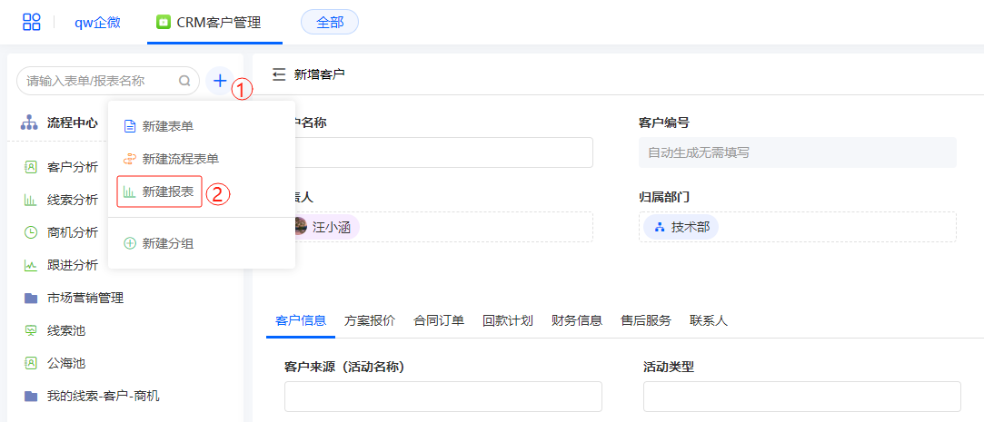 在应用中>>新建报表>>创建分析报表 如下图所示: