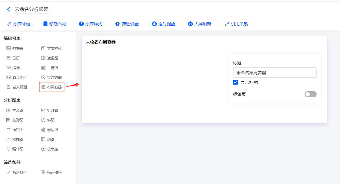 在报表设计界面,可以点击「布局容器」进行添加。如下图所示: