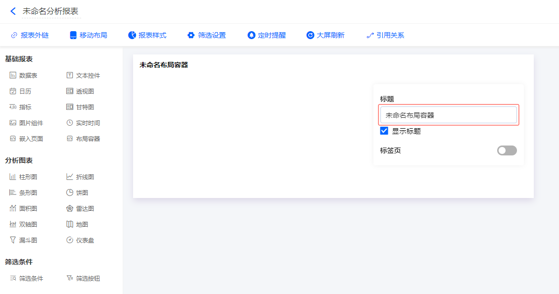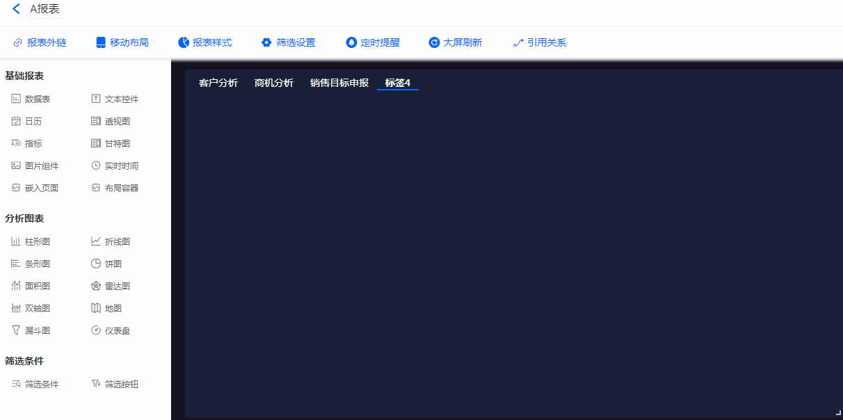 可直接拖动左侧[基础报表]、[分析图表]中的组件进布局容器内。如果有多个标签,将拖入选中的标签页中。