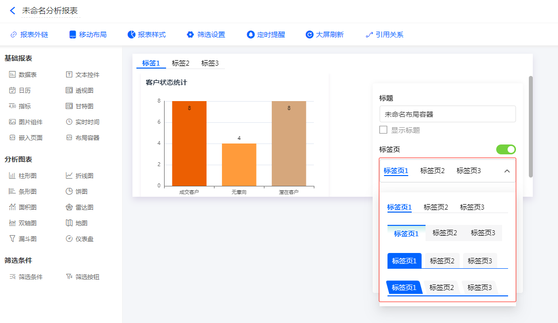 开启标签页后,可切换标签页的展示样式,有3种预设样式,可以根据报表设计需要自由选择。