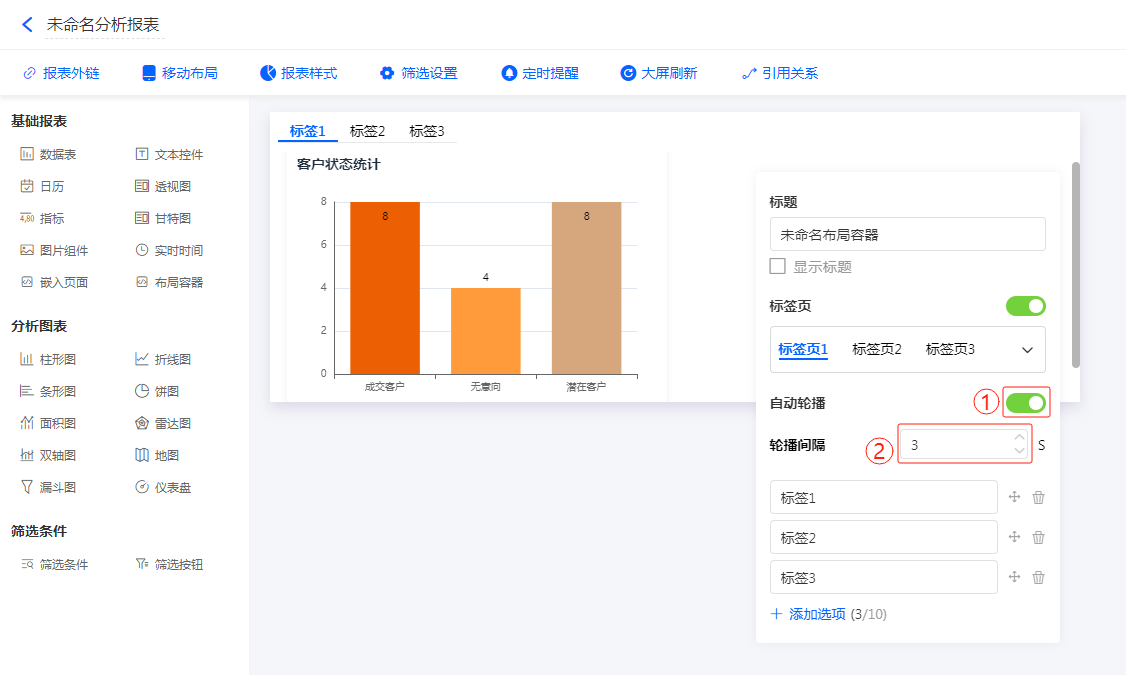 多标签页开启后,支持对多标签页设置自动轮播及轮播间隔时间。如下图所示: