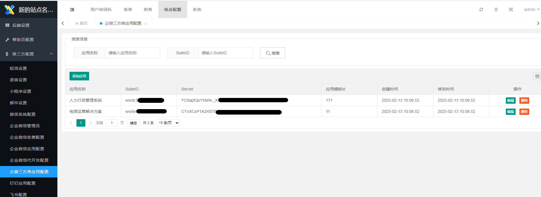 前提:站点已完成企业微信应用第三方模式配置,详见企业微信应用第三方模式配置。